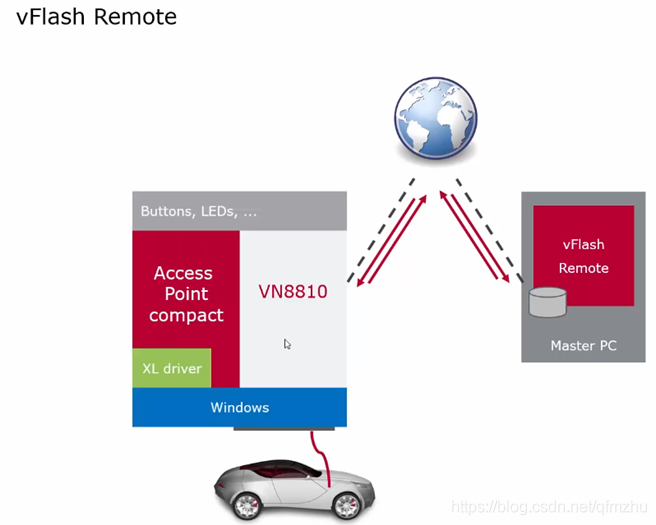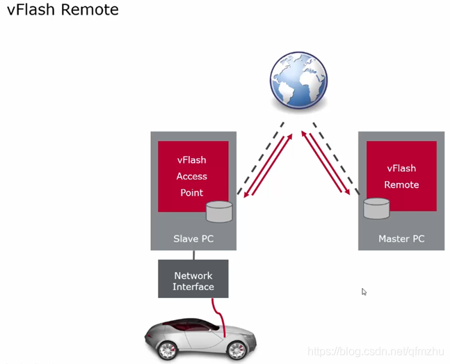 除了vFlash station以外,它还有另一个扩展的License,就是vFlash Remote,它和我们刚刚讲到的Indigo Remote类似,是一个远程刷写的方案。那么我们需要一个vFlash 的现场端,现场端提供这个ID和密码,让我远程端去输入我的IP和密码,同时连上服务器,那么我就知道我们两端可以连接上,然后我的vFlash Remote这一端,加载我的这个vFlash Pack工程,然后传输到我的现场端,然后去执行相应刷写的动作。