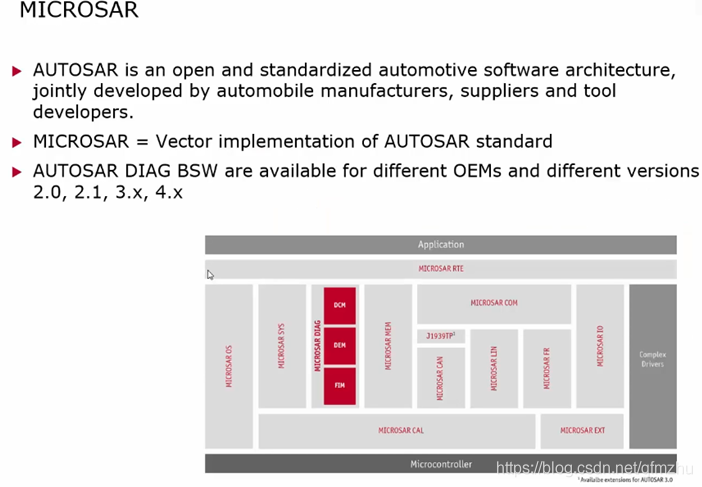 另外一种就是我们Autosar解决方案MICROSAR,其中的MICROSAR DIAG诊断的部分包含我们的DCM,DEM和FIM相关的这些模块,那它的一个实现方式也是将我们的CDD或者ODX文件导入到我们的配置工具“达芬奇”里面,自动生成和诊断相关的一些底层代码,以及应用层接口。