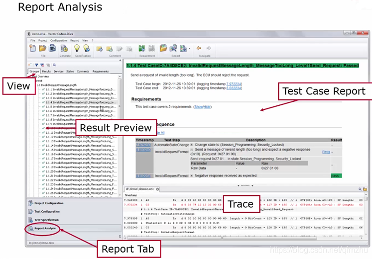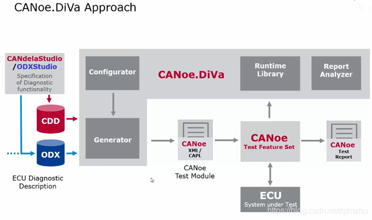 CANOE.Diva的一个流程,把CDD和ODX文件导入到Diva工程当中,然后去通过一些相应的配置,点一个按钮自动生成诊断相关的一些测试用例,那这部分测试用例实际是CANOE的一个测试模块,所以需要把Diva的工程导入到CANOE当中去连接ECU,去执行这些测试用例,最终自动生成相应的测试报告。