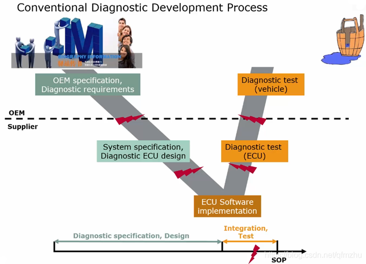 诊断流程遵循“V-L型”的一个开发和使用流程,“V”是指开发阶段,从需求定义到代码实现,到集成测试;L是指生产售后阶段是使用诊断功能的一个阶段。