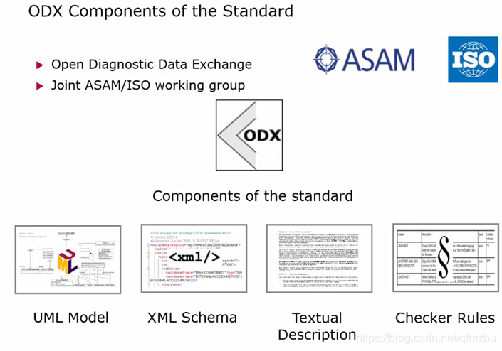 现在我们所读到的ISO 22901这个ODX标准是基于ASAM的ODX 2.2.0来进行定义的,ODX标准里面,它定义4个部分的内容,第一个是UML建模,通过这种建模语言,来描述不同的层级不同的参数之间的一个关联关系,那在实际使用的时候呢,是将UML建模转换成XML结构,也就是ODX文件,实质上是一种XML语言结构的一个文件。