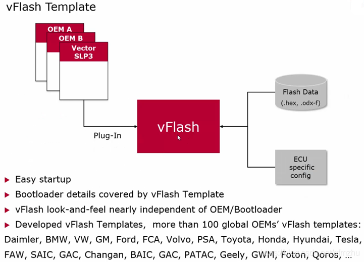 刷写功能的实现,首先是我们ECU本身也需要有Bootloader的代码,来支撑这个刷写的功能,当然Vector也提供相应的flash Bootloader的代码包,另外我们的vFlash是一种通用型的上位机工具,为什么说它是通用型的呢?因为我们可以支持不同的总线,包括CAN,DoIP,FlexRay等等,我们支持不同的刷写格式,比如传统的Intel-Hex,Motorola-s,Binary等等,以及ODX-F相关的这个格式,也可以支持不同的OEM刷写规范刷写序列。