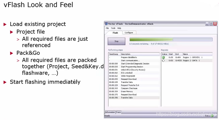 那我们可以将我们的这个刷写工程保存成一个Pack&Go的一个格式,也就是vFlash Pack,这个vFlash 相当于是一个打包好的一个工程,然后这个工程里面会包含你的,比如说Seed&Key文件,你的刷写文件,你的vFlash Template等等,全部包含在里面,那这个vFlash Pack可以直接被vFlash打开,然后去进行刷写执行,也可以被其他的工具比如说Diva进行直接的调用。