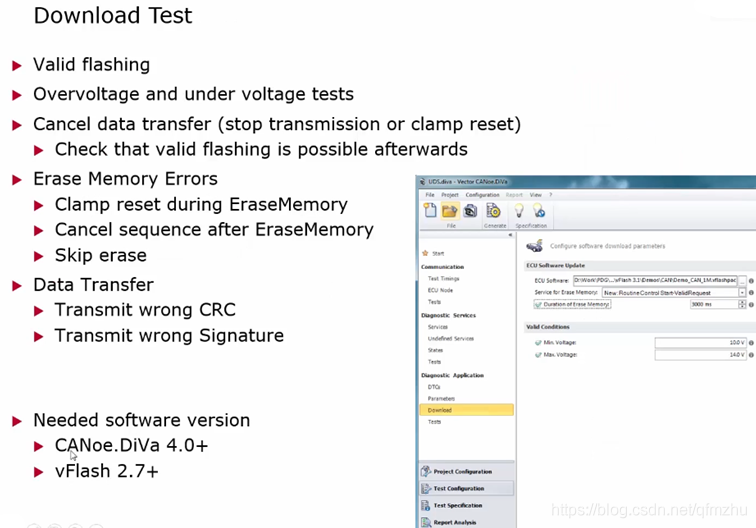 那对于刷写的测试呢,我们是从CANOE.Diva 4.0版本开始支持的,它需要调用我们的vFlash工具所做的一个vFlash一个工程,完整的一个刷鞋的工程来进行测试,它可以对有效的刷写流程进行测试,也可以在刷写流程当中去制造一些故障,然后来看我们的刷写是否会被停止,以及我们的ECU是否可以重新被刷写等等。