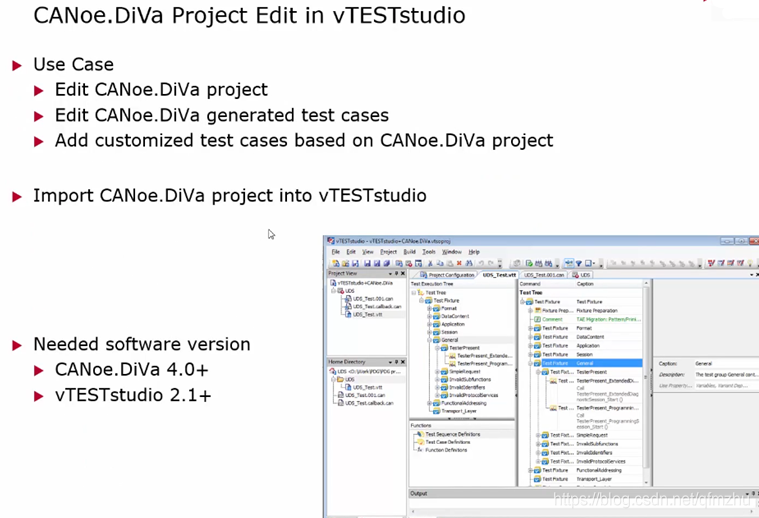 CANOE.Diva是自动生成诊断和刷写相关的测试用例的工具;而我们另外一个工具vTESTstudio是用来去编辑测试用例这样一个工具,并且他们的执行环境都是CANOE,现在我们可以把CANOE.Diva的工程,直接导到vTESTstudio里面,把他们合并到同一个测试工程,并且在此基础上添加一些Diva可能暂时还不支持的一些测试用例。