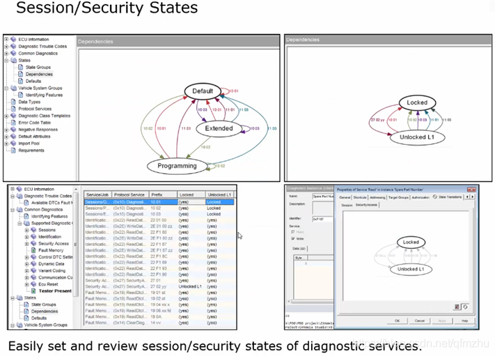 第3个部分我们会话和安全集状态的一个设置,会话和安全集是两个独立的状态,这两个状态呢,在CDD文件里面会有两个独立的表格,在这个表格里面可以针对你每一条服务精确到每个Subfunction,精确到每一个DID,来建立你在某一个会话,某一个安全集下,是否可以执行,或者涉及到相应的状态跳转,在状态跳转机制设置好后,我们可以有图形化的显示,来显示你相对应的状态之间,通过什么样的服务来进行跳转,那我们可以直观的去检查,我们的状态跳转是否正确。