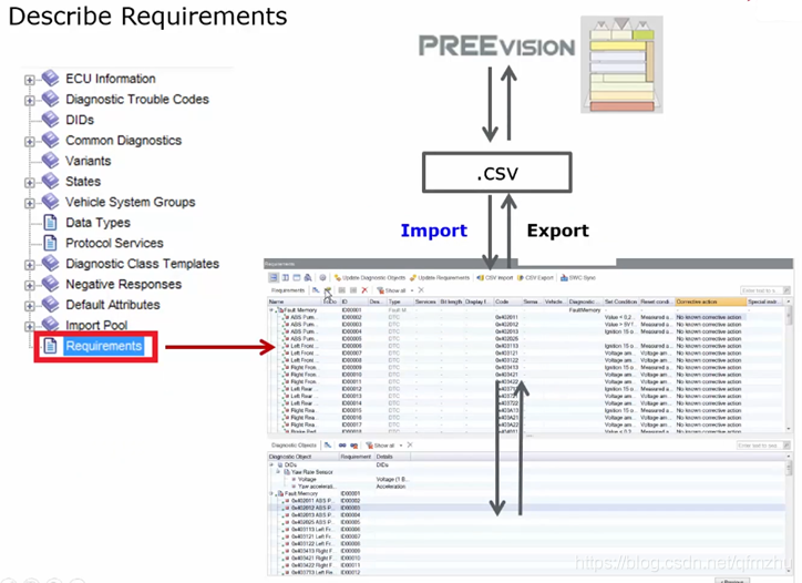 除了我们上面说的3个部分呢,是我们描述一个诊断需求规范必要的三个部分,另外呢CANdelaStudio也可以用来描述需求,也就是我们可以做一个需求的匹配,比如说我们从我们另外一个provision里面可以导出我们的诊断需求文件CSV,在这个需求文件里面定义了我有10条DID的一个需求,那我就可以映射到我现在定义的在CDD文件里面定义的相关的DID,然后我实际需求文档里面的DID,然后做一个匹配,然后来看一下我现在的CDD文件是否已经满足我所有的一个需求。