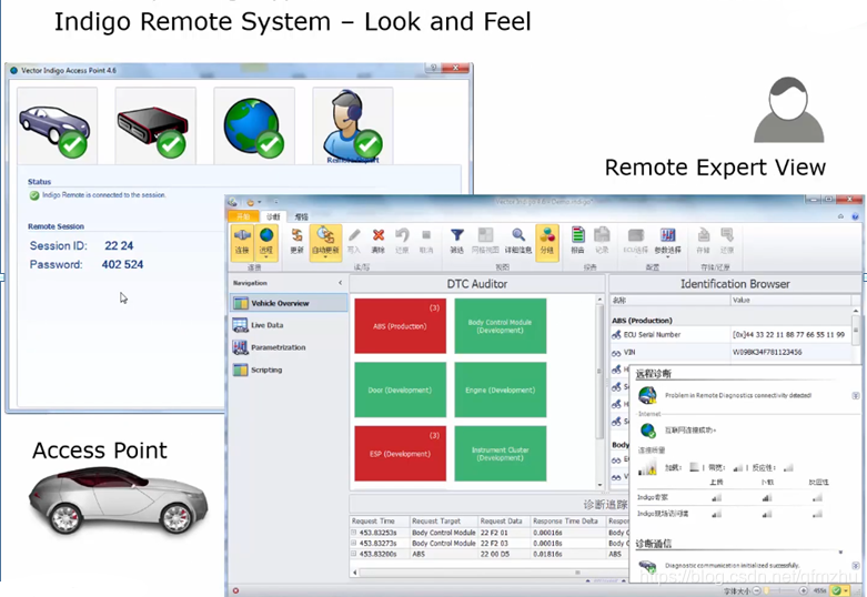 Indigo除了是现场的一个诊断仪以外,它也可以支持一个远程的介入,通常我们的整车试验场或者说我们车辆可能在外地,然后我们的诊断专家他可能在另外一个城市,那这个时候如果诊断专家需要去获取到车辆的一些信息的时候,我诊断专家通常都是出差到本地去做一些诊断的工作,但是这个时候我诊断专家比较忙,现场也比较紧急,这样一些情况的话,这个时候通过远程的方式来连接,那现场端 Indigo Access Point这个现场端然后连接我们的这个接口卡,然后去连接我们的车辆,然后通过WiFi连上后台的服务器,远程专家这端也是任然应用的Indigo这个工具,只是带有Indigo Remote license,然后去用WIFI连上我们后台的服务器,两个之间相互对接上。