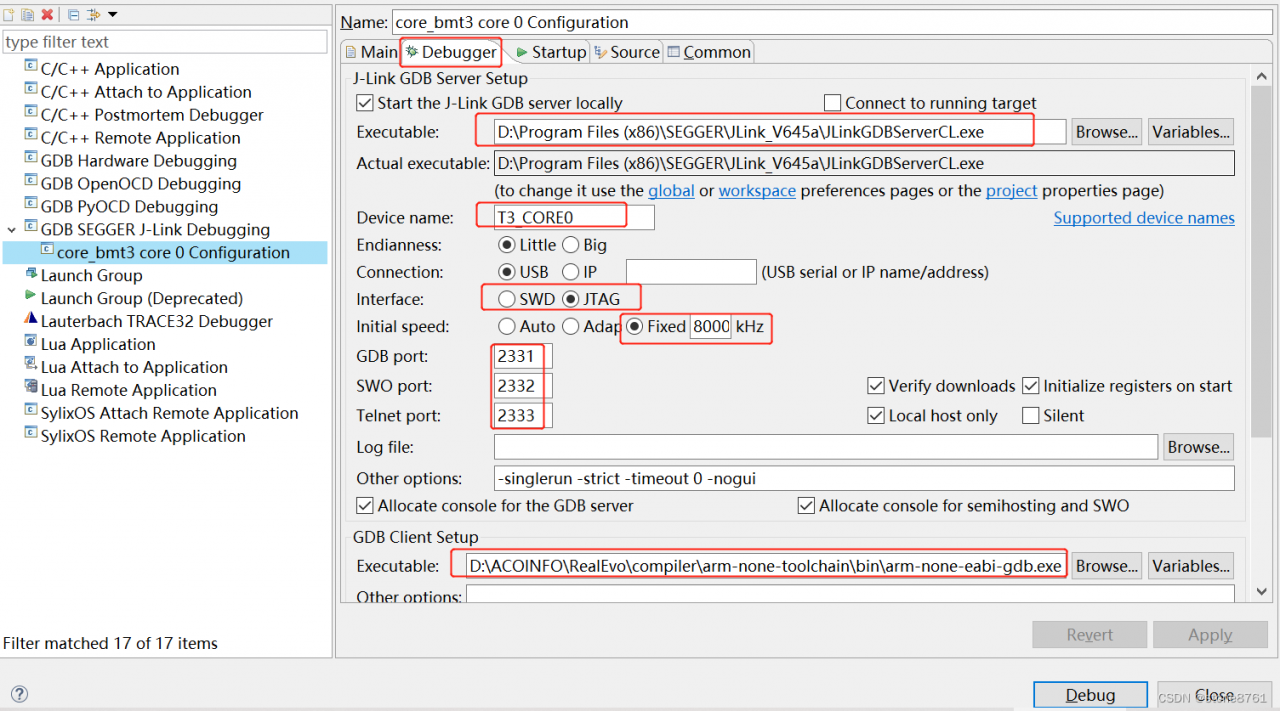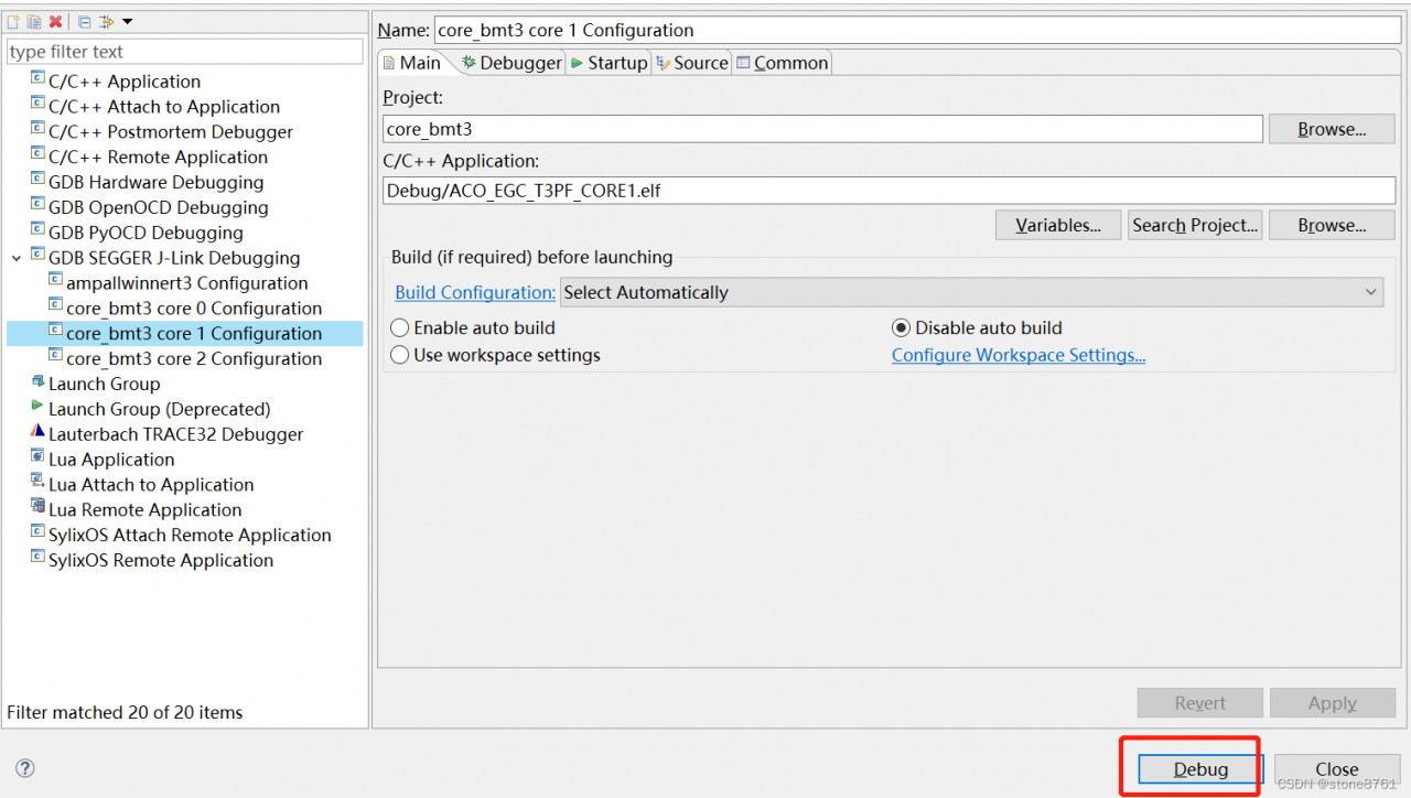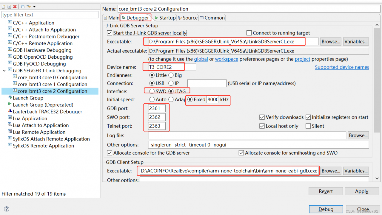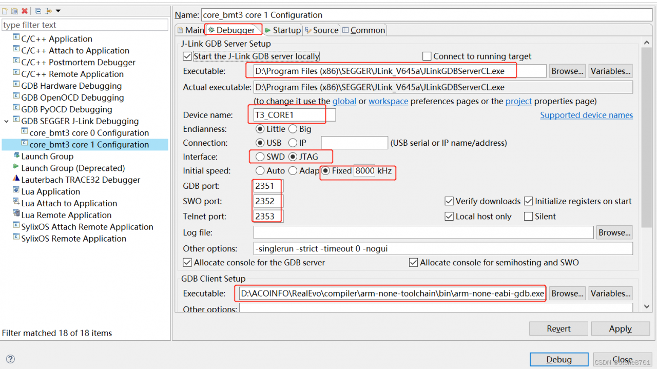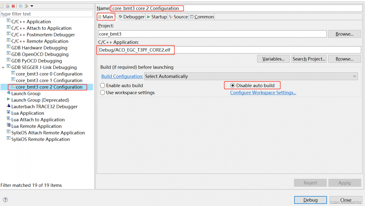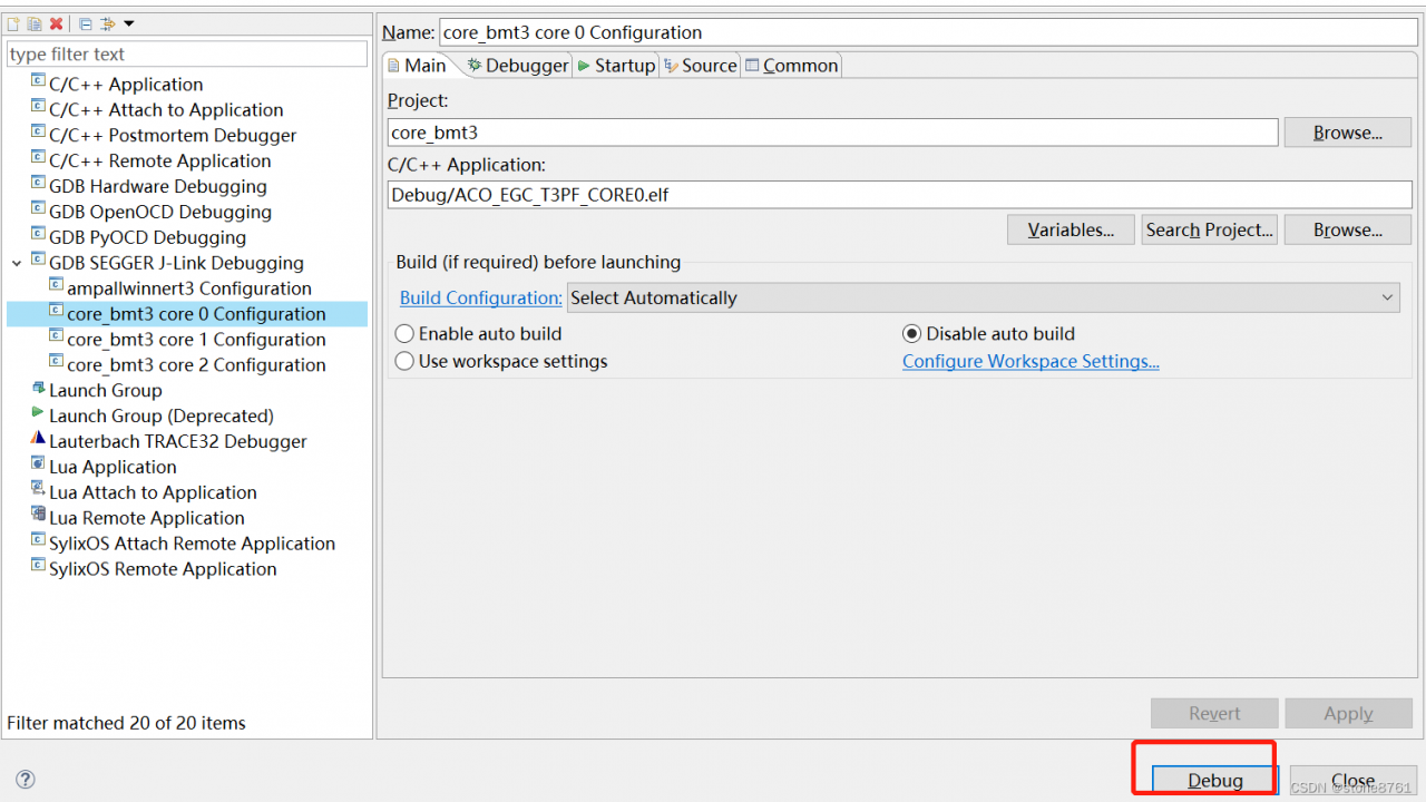 2、右键 core_bmt3 工程,点击 Debug As ---> Debug Configurations... 双击 GDB SEGGER J-Link Debugging 新建一个调试实例。配置 core0 调试参数,如下图: