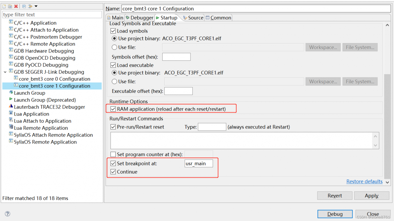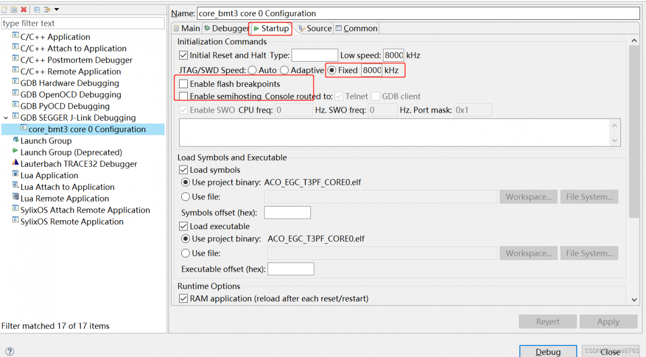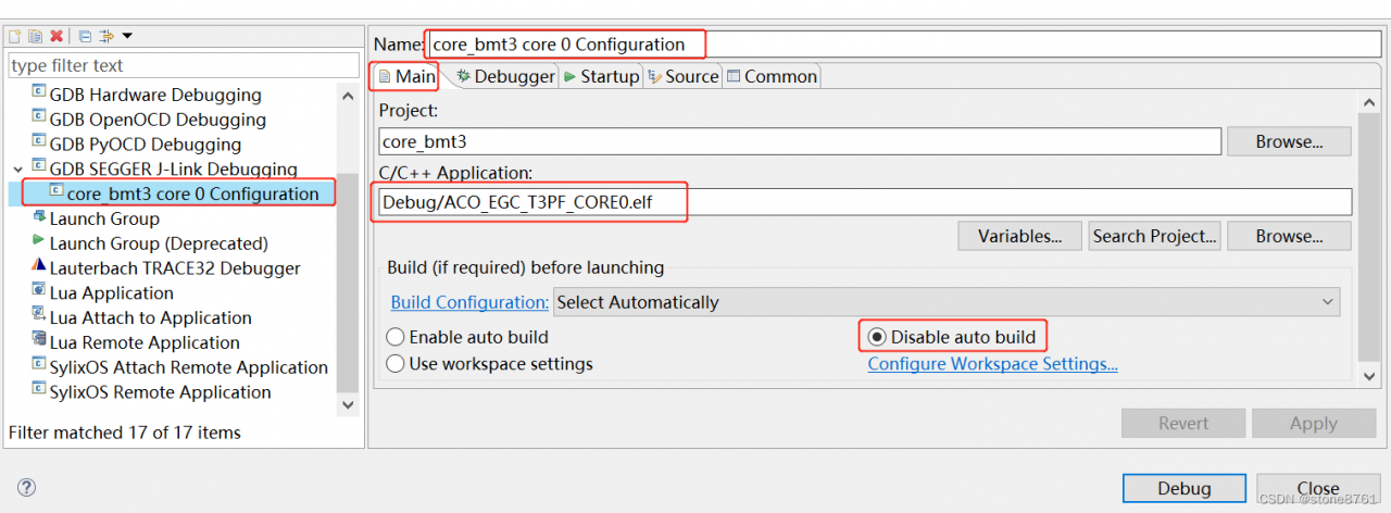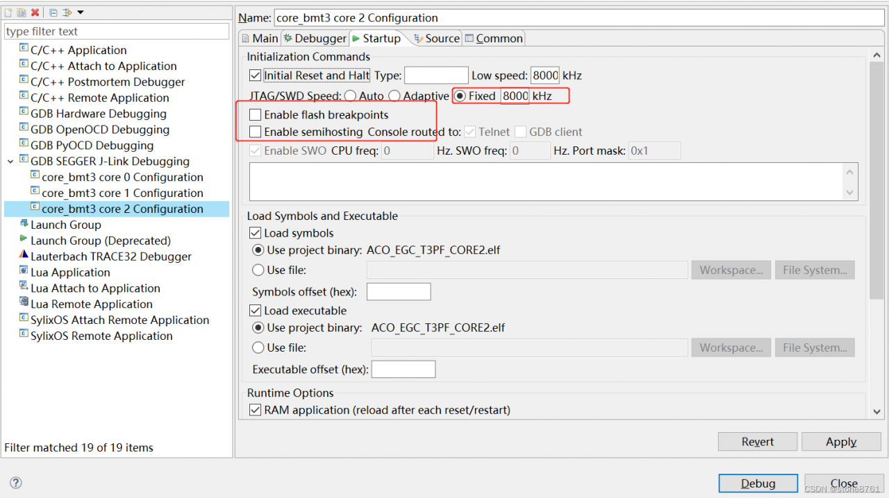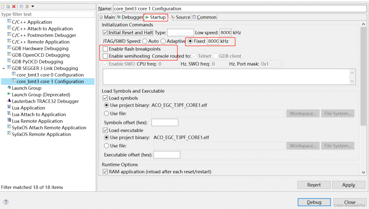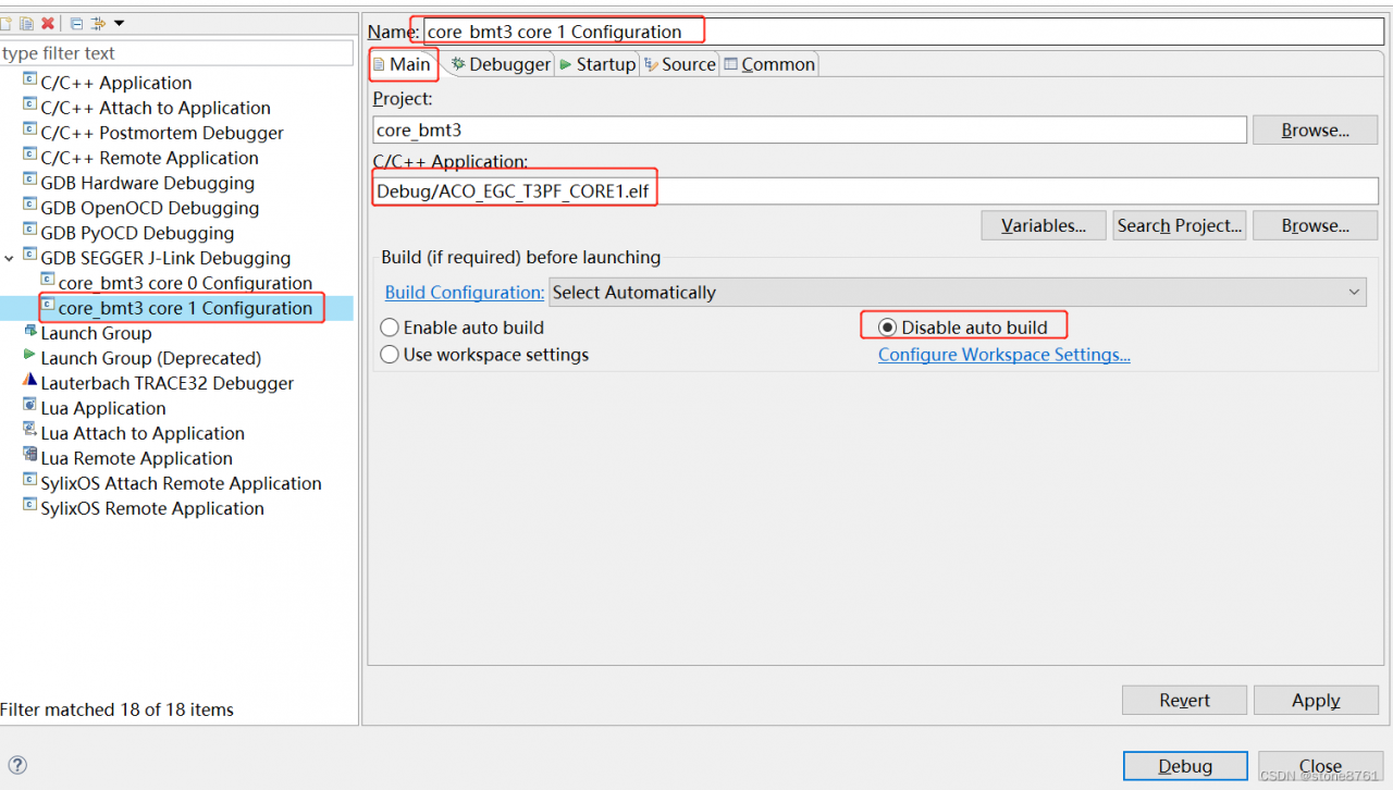 2、右键 core_bmt3 工程,点击 Debug As ---> Debug Configurations... 双击 GDB SEGGER J-Link Debugging 新建一个调试实例。配置 core0 调试参数,如下图: