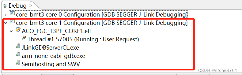 5、使用同样的方式启动 core2 和 core3,4 个核都启动后可以通过 Debug 窗口切换调试对象,从而实现 4 核同时调试。