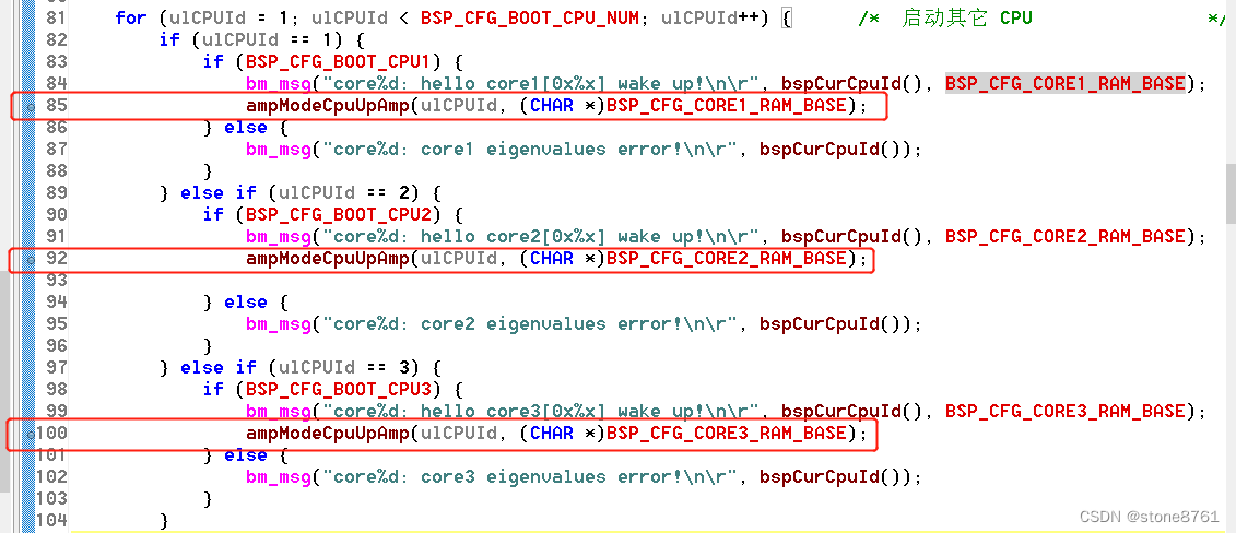 3、在代码 core_bmt3/SylixOS/bsp/bspInit.c 中的函数 halWakeUpOtherCores() 内启动核 1/2/3 的位置上加上断点