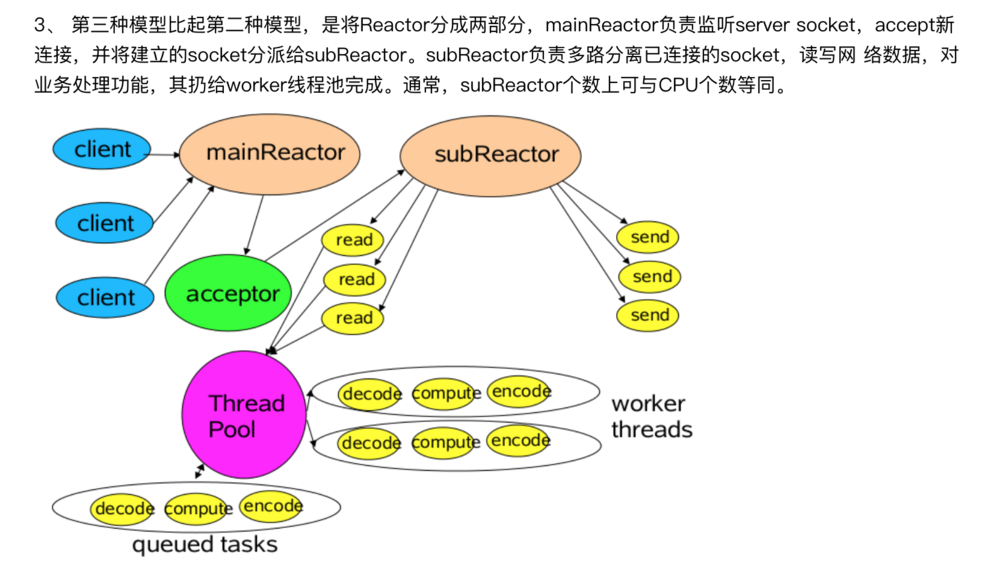 主从Reactor多线程:多个acceptor的NIO线程池用于接受客户端的连接