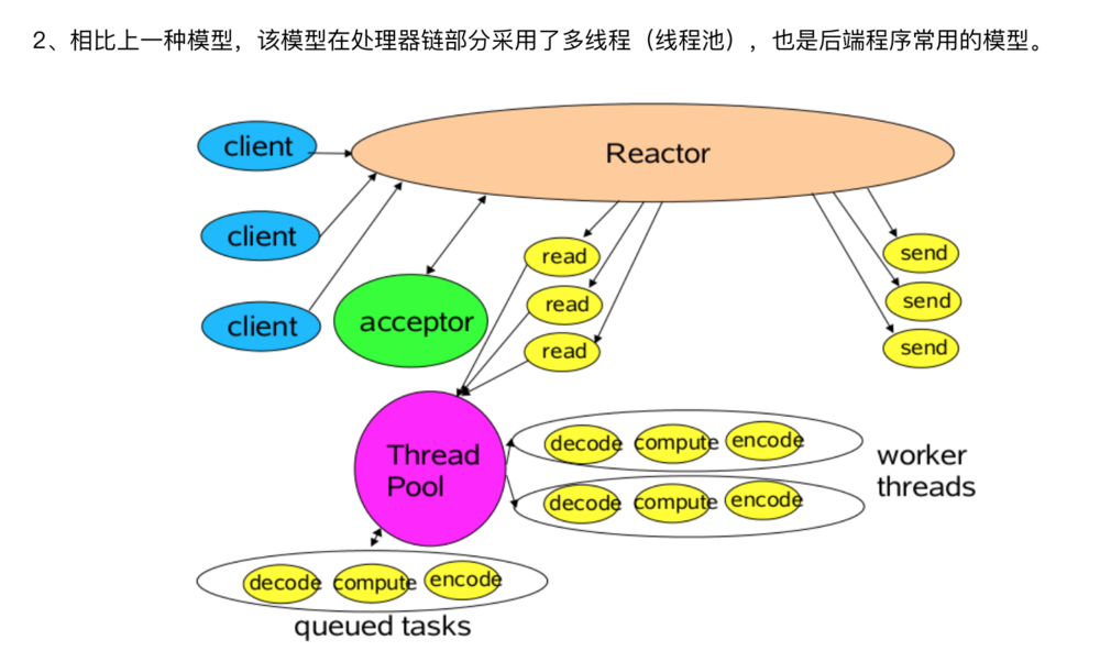 Accept连接和读写操作也可以使用同一个线程池来进行处理。而请求处理逻辑既可以使用单独的线程池进行处理,也可以跟放在读写线程一块处理。线程池中的每一个线程都是NIO线程。用户可以根据实际情况进行组装,构造出满足系统需求的高性能并发模型。