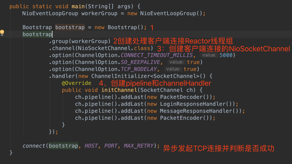 4、5、创建处理网络事件的ChannelPipeline和handler,网络时间以流的形式在其中流转,handler完成多数的功能定制:比如编解码 SSl安全认证