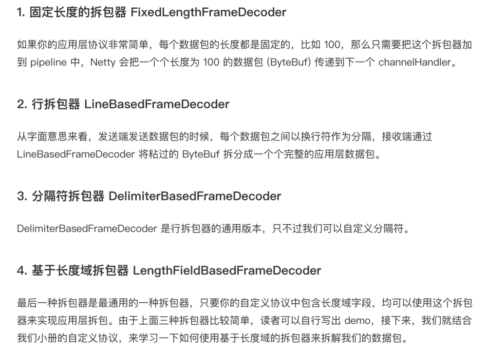 而在Netty中,已经造好了许多类型的拆包器,我们直接用就好: