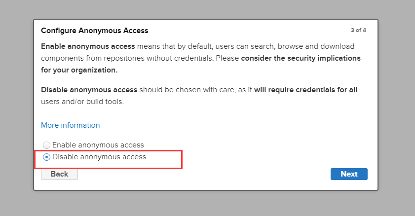 12、按自己需求选择,禁止匿名访问还是允许,这里楼主选择禁止,点击下一步,直到最后一步,nexus3就安装好了。