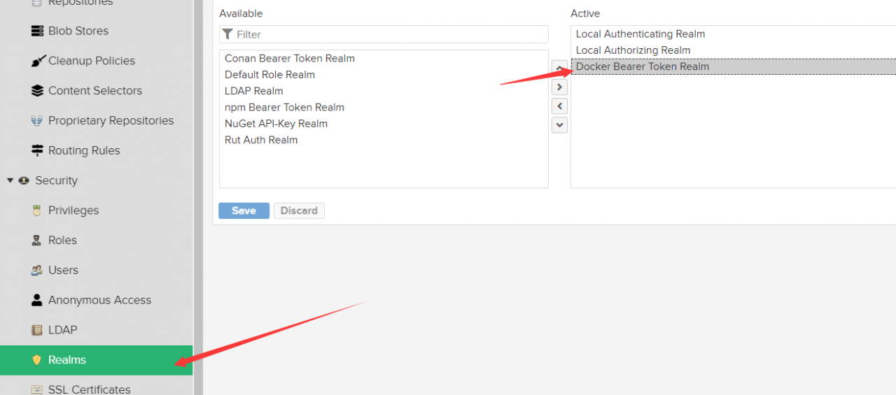 5、在如下把Docker Bearer Token Realm移到右边,点击保存。