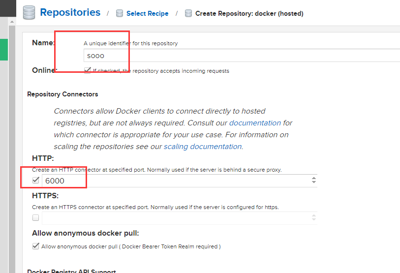 3、输入用户名,然后输入刚刚设置的docker上传下载登录的端口号,剩下的默认,或者选择自己需要的功能;最后拉到最底,点击create repository选择创建仓库。