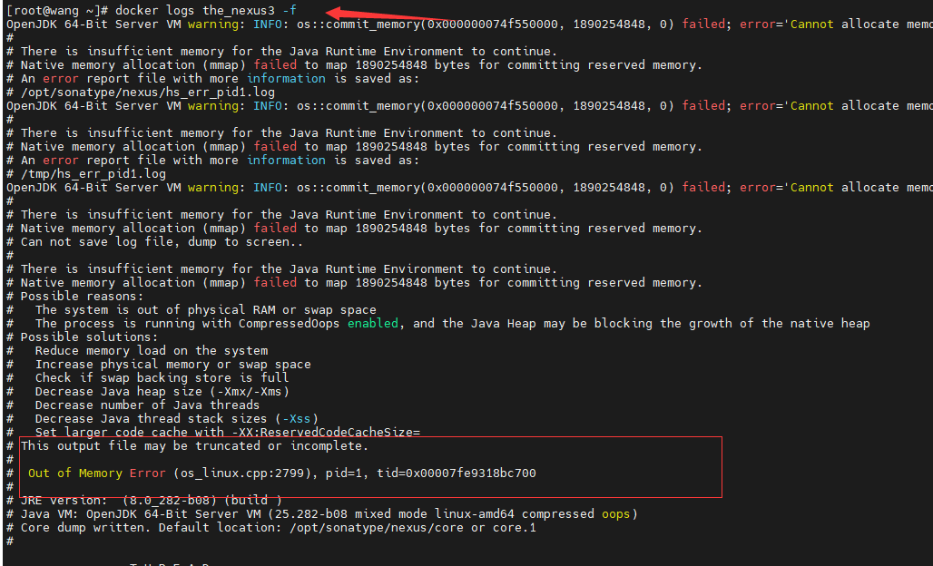 docker logs the_nexus3 -f运行日志发现如下,提示物理内存不足,原因是主机配置较弱,启动时候需要指定配置。