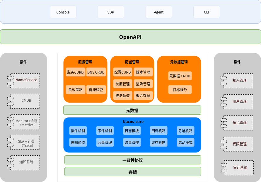 SMS系统打通,通知到对应人数据变更 OpenAPI:暴露标准Rest风格HTTP接口,简单易用,方便多语言集成Console:易用控制台,做服务管理、配置管理等操作SDK:多语言sdkAgent:dns-f类似模式,或者与mesh等方案集成CLI:命令行对产品进行轻量化管理,像git一样好用