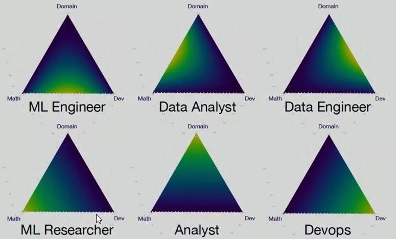 数据科学家应该处于图片中间的位置,但实际上他们可以处于三角形的任何位置,不同位置对应了不同的专家能力。