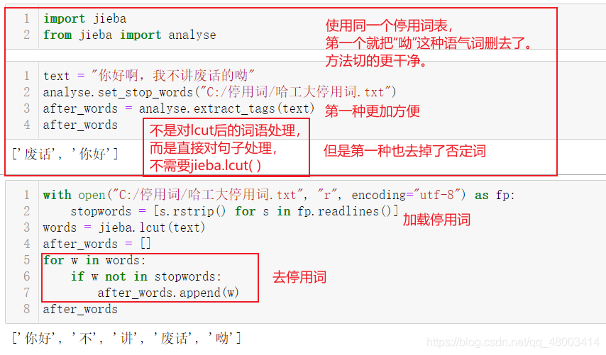 作用原理就是在分词之后,手动遍历分词结果,看他是不是在停用词列表中,如果在,就把他删除。