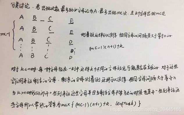 这道题目还是挺有难度的,思路比较难想。在力扣官方的题解中使用的是构造的方法,先统计一下出现次数最多次数的字母,设出现次数最多的字母有k个,分别为A,B,C,D...,最大次数为maxc,当k <= n的时候我们需要将这些每一个相同的字母排成一列,这样这些字母就有maxc行,并且每一行的有n个空位,这些空位首先是安排这些出现次数最多的字母,然后放剩余出现次数小于maxc的字母,对于剩余的字母我们是倒着放的,这样对于相同的字母间隔的数目一定是大于等于n的满足题目的要求,上面放所有字母的时候是属于有空位的情况,所以还存在其余的两种情况分别为k > n和剩余的字母无法放到空位上了,那么我们就需要开另外的列来放这些字母,并且也是倒着放的,新开的这些列相当于是原来的那些字母只是放的位置与原来需要逆着重新排列一下,这样就一定可以满足相同字母的间隔是一定大于等于n的,并且可以发现最终的答案一定是max{(maxc - 1) * (n + 1) + k, len(task)}。
