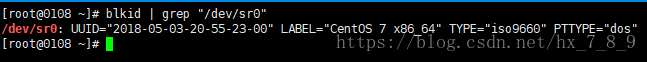 ② 用 命令blkid | grep "/dev/sr0" 查看 光盘的UUID 及 文件类型;如下图