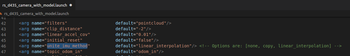 unite_imu_method: The D435i and T265 cameras have built in IMU components which produce 2 unrelated streams: gyro - which shows angular velocity and accel which shows linear acceleration. Each with it's own frequency. By default, 2 corresponding topics are available, each with only the relevant fields of the message sensor_msgs::Imu are filled out. Setting unite_imu_method creates a new topic, imu, that replaces the default gyro and accel topics. The imu topic is published at the rate of the gyro. All the fields of the Imu message under the imu topic are filled out.