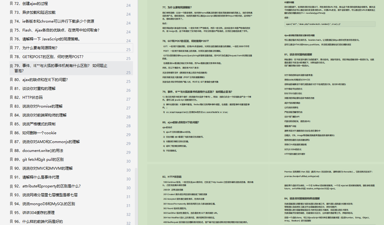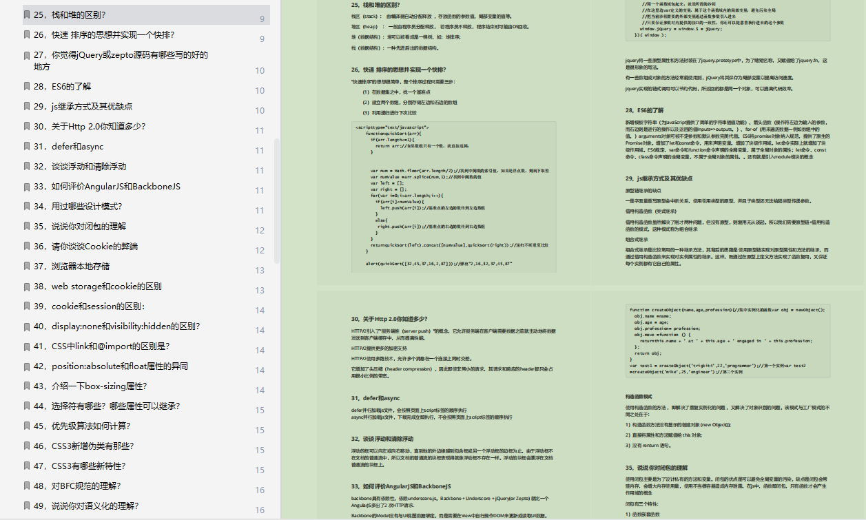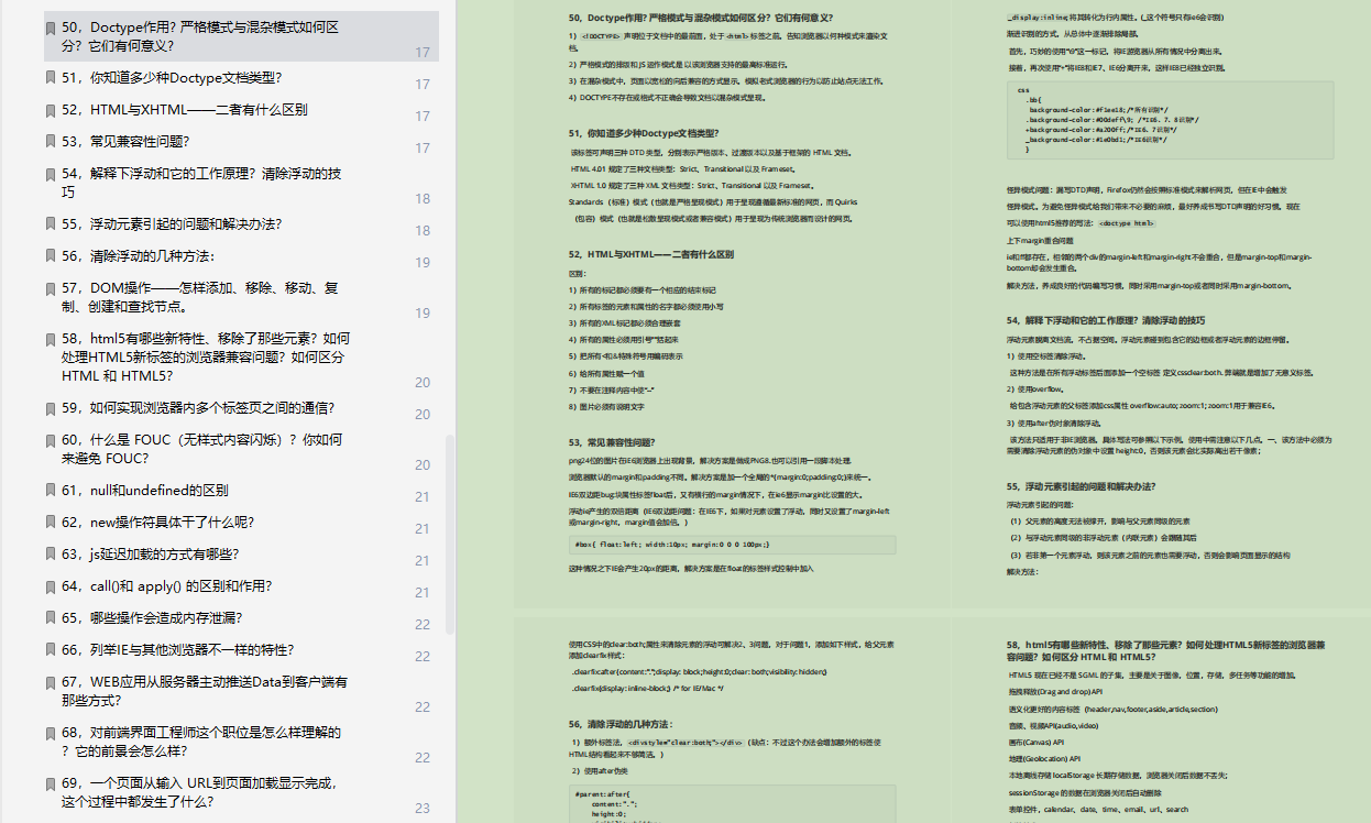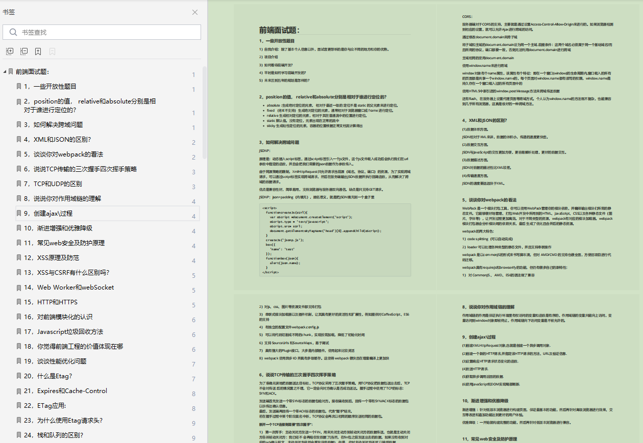 里只列出了面试题,和部分截图,不过面试题和详解都已经整理成PDF文档,可以看文末免费领取!可免费领取资料还包括CSS面试题总结,JavaScript面试题总结,Vue面试题总结,React面试题总结,常用算法等等。