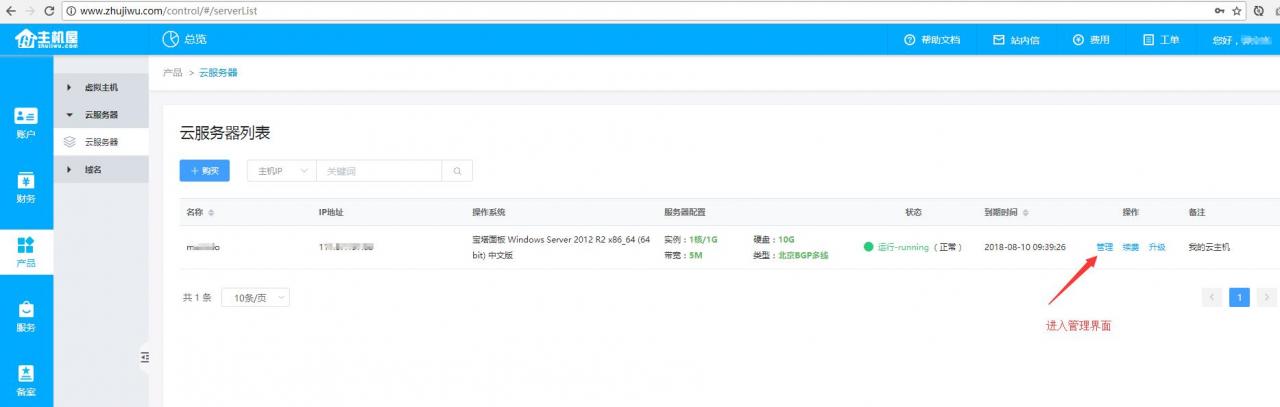 三、在云服务器界面点击管理,进入管理界面,操作如下;