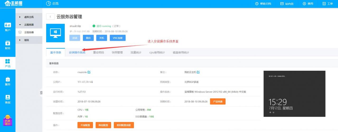 四、如未安装操作系统(购买后默认是没安装的),点击进入安装操作系统界面,操作如下;