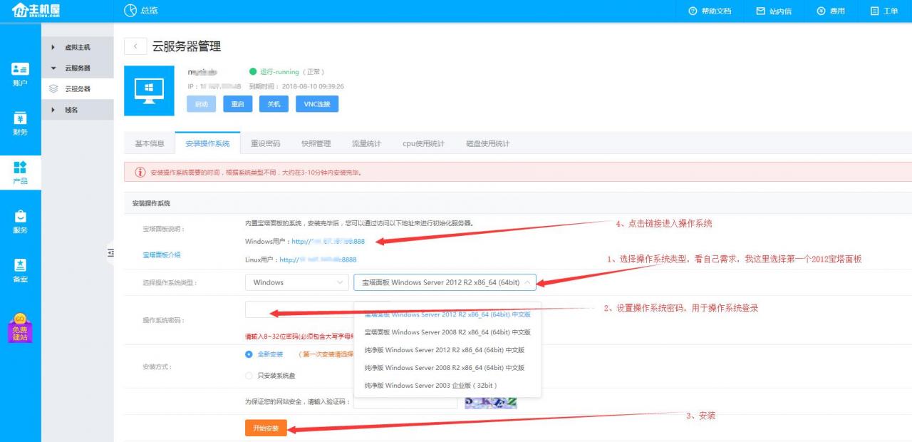 五、按下图1到4步骤操作,进行操作系统的安装,安装完毕后点击图中第4步所指链接进入操作系统(此处为宝塔面板);