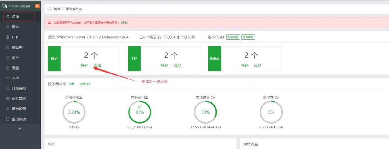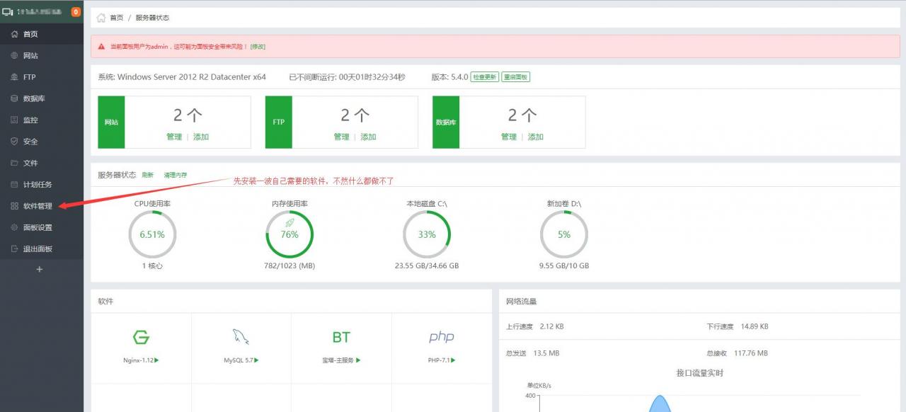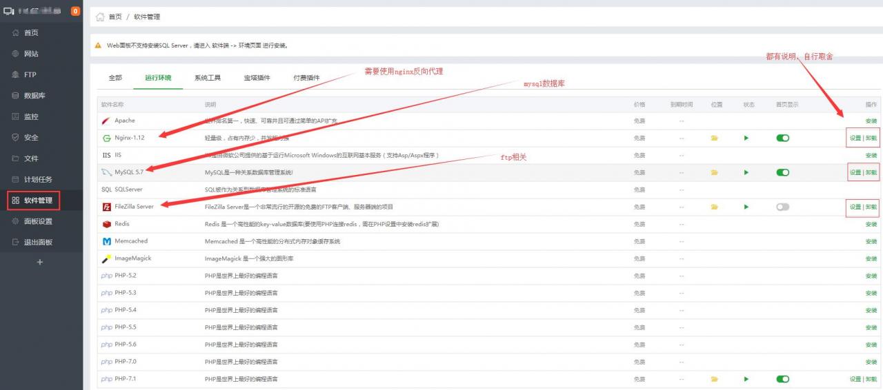 六、进入宝塔面板,先安装运行环境、ftp等软件,否则无法继续后续操作;