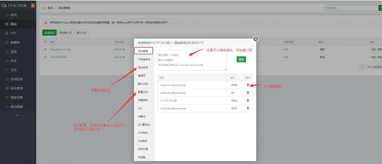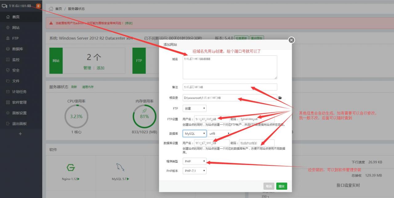 九、添加网站操作如下图所示,在“域名”输入框中填写域名或ip然后添加端口即可,其他资料会自动补全,亦可自行修改,注意不要占用其他默认开通的端口,填写完毕点击提交即完成添加网站;
