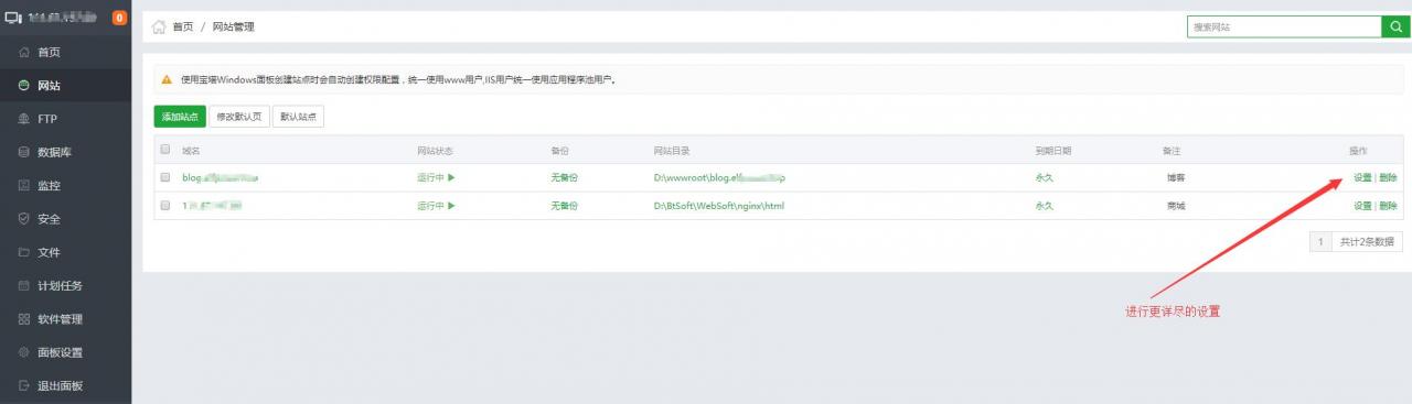 十、点击侧栏网站导航,进入网站管理界面,可以看到所添加的网站,点击设置按钮可进行设置修改;