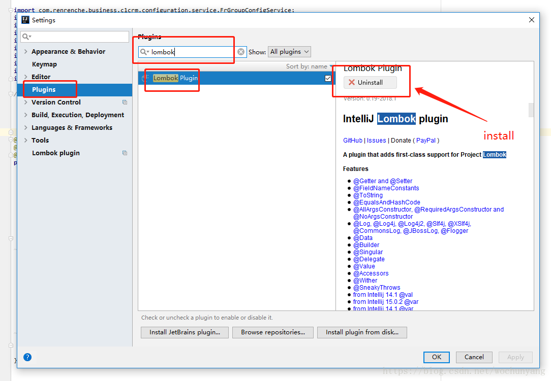 打开IDEA的Setting –> 选择Plugins选项 –> 选择Browse repositories –> 搜索lombok –> 点击安装 –> 安装完成重启IDEA –> 安装成功
