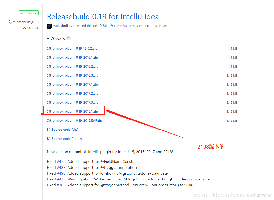 https://github.com/mplushnikov/lombok-intellij-plugin/releases,网址打开后同样可以看到插件的版本信息: