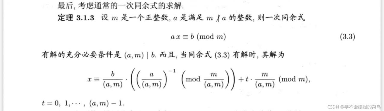 求解一元同余式的方法:照着公式编程就行。下面找的是一次同余式的通解,但是在ctf比赛中实际上只有一个flag,所以只有一个解,因此(a,m)就是1,这样编程的时候公式可以简略好多。