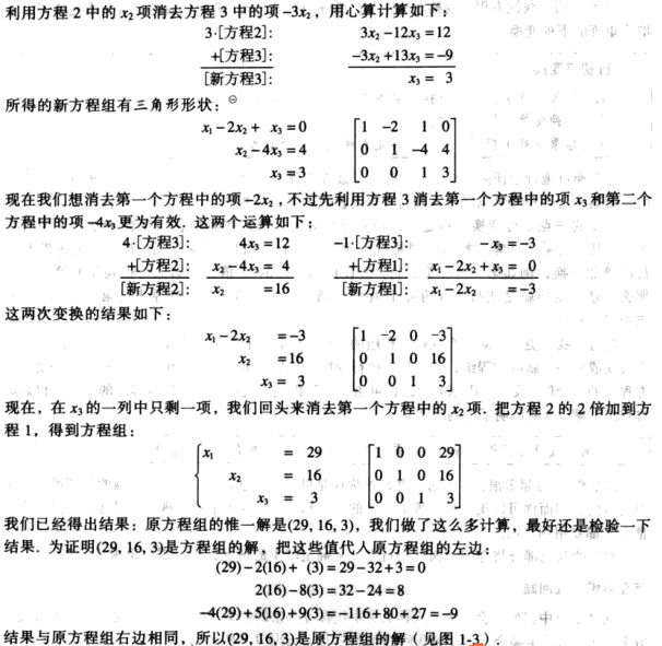 方程AA-1=I及矩阵乘法的定义说明A-1的列正好是方程(1)的解,这一点很有用。如果只需要A-1的一列或两列,这时只需要解(2)中的相应方程