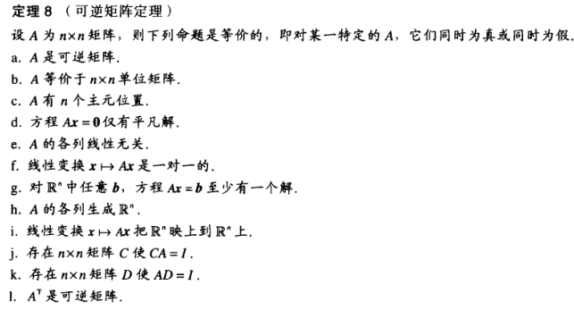 定理:若A是可逆n*n矩阵,则对每一个Rn中的b,方程Ax=b有唯一解x=A-1b