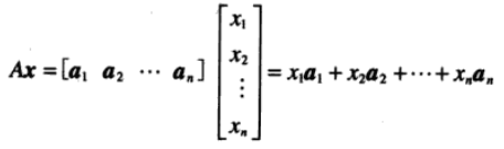 Ax=b:若A是m*n的矩阵,各列为a1,...,an。若x是Rn中的向量,则A与x的积,记为Ax。就是A的各列以x中对应元素为权的线性组合