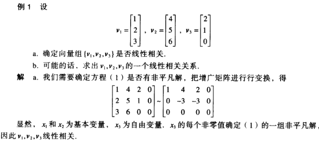 方程2称为向量v1,...,vp之间的线性相关关系,其中权不全为零,一组向量为线性相关,它不是线性无关的。