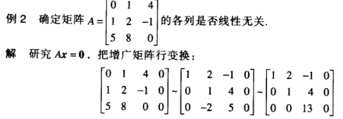 方程有3个基本变量,没有自由变量,因此方程Ax=0仅有平凡解,A的各列是线性无关的。