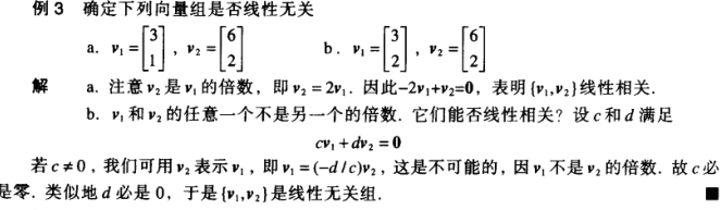 两个或多个向量的集合S={v1,...,vp}线性相关,当且仅当S中至少有一个向量是其他向量的线性组合,事实上,若S线性相关,且v1 ! = 0,则某个vj(j>1)是它前面几个向量v1,...,vj-1的线性组合