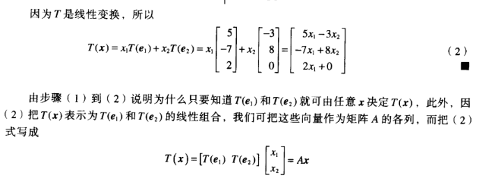 定理:设T:Rn->Rm为线性变换,则存在唯一的矩阵A,使T(x)=Ax,对Rn中一切x。A是m*n矩阵,它的第j列是向量T(ej),其中ej是单位矩阵In的第j列:A=[T(ei) ... T(en)]