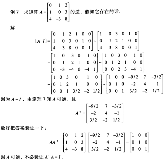 求A-1的算法:把增广矩阵[AI]进行行简化,若A行等价于I,则[AI]行等价于[IA-1],否则A没有逆