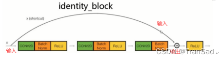 而identity_block就很简单啦(如下图)就是一条边,对应着所有实线部分。当输入输出的尺寸、通道数前后都没有变化时,输入就可以直接加到输出上。