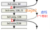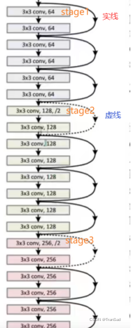 通过各个stage的标记位置可以对比两张图,我们对ResNet残差块具体是怎么连接的就清楚多了。可以发现除了正常的卷积之外,最显著的特点就在于每个残差块旁边都带了要么实线要么虚线的残差边。